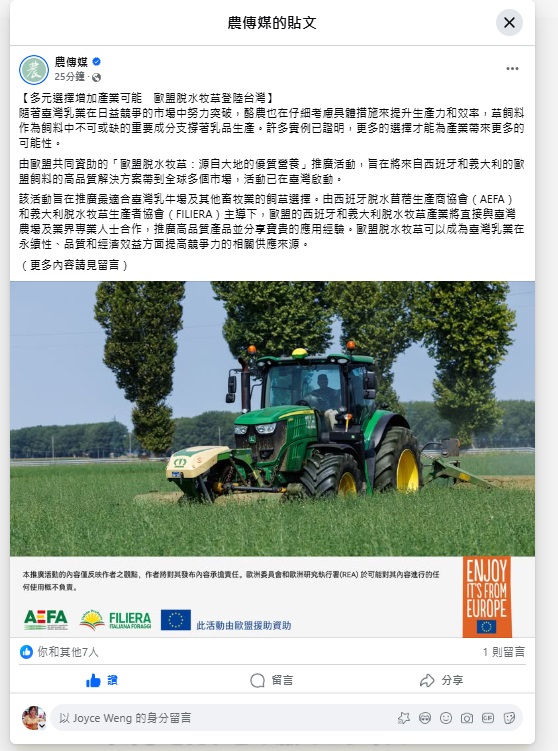 專案關鍵價值:由歐盟贊助為期三年的「歐盟脫水牧草: 源自大地的優質營養」推廣活動,2024年正式在台灣啟動,第一年主要工作為相關資訊的翻譯工作,包括網頁繁體中文、第三及第四季電子報、多個影片旁白等等。另一項為與農傳媒的廣編稿合作,將歐盟脫水牧草的特色,包括生產到運送的詳細製作過程,刊登在農傳媒網頁及臉書平台,短短一星期已成功吸引超過萬人點閱。
